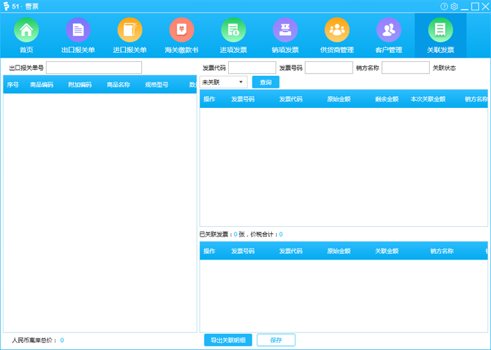 报关单关联发票,拆分关联发票金额;一键导出关联明细。