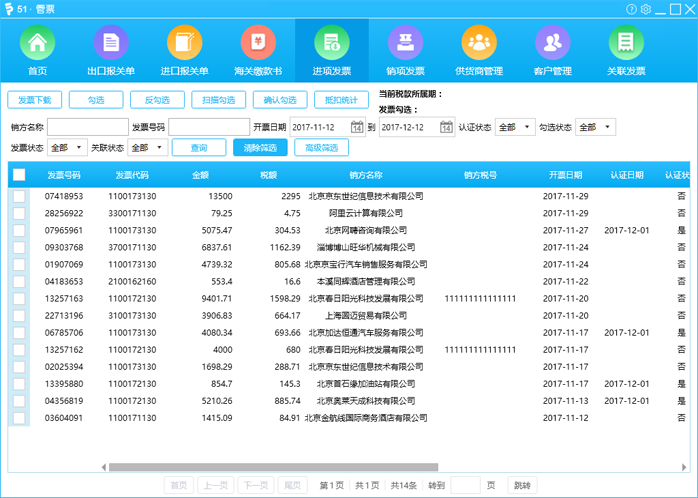 进项发票下载管理,在线勾选确认,支持扫描勾选认证,一键导出抵扣统计报表。