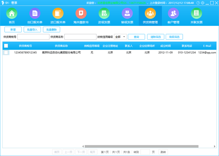 供货商管理,实现批量导入、删除,在线修改、保存,实现对进项发票的便捷管理。