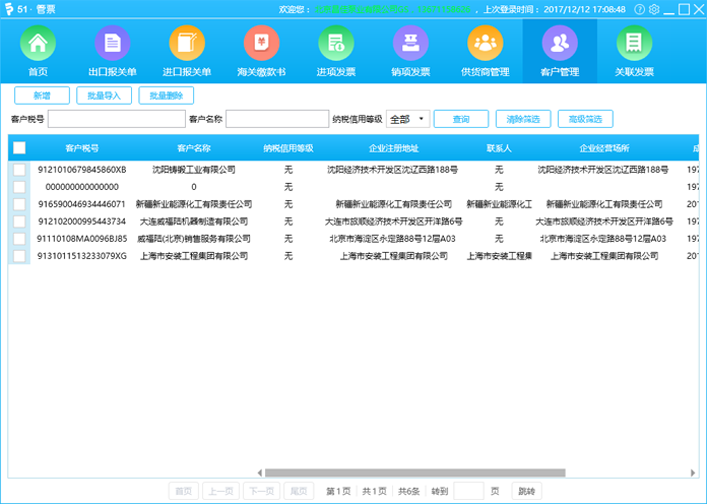 客户管理,实现批量导入、删除,在线修改、保存,实现对销项发票的便捷开具。