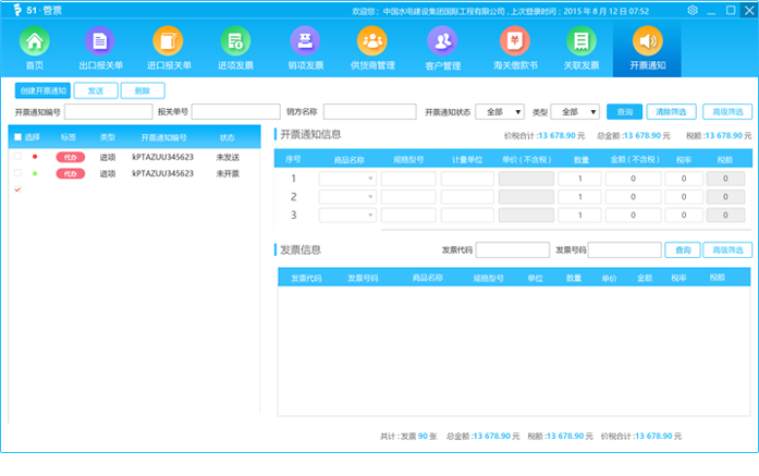 支持上下游企业协同开票,一键发送开票通知书及自动接收开票通知,系统自动校验并回写开票信息。
