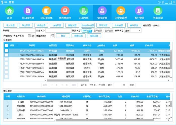 销项发票管理,自动拆分合并发票明细数据,一键批量导出XML,实现便捷开票,便捷标签快速检索。 一键生成开票确认链接;批量开具出口发票及代办退税发票;